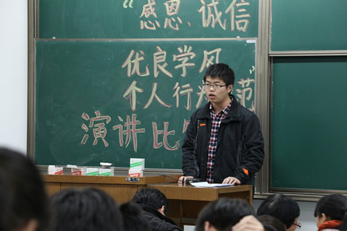 紧接着,在有关“诚信”的演讲中,林云、陈力伟、彭琳、宿柏歌等同学通过深刻的解析和案例说明,披露了生活中不尽人意的事件,告诫我们应该将诚信播种于大地,让它发芽、成长。同时,参赛同学关于诚信的演讲也敲响了同学们的警钟,在平时的日常学习生活中,作为大学生的我们更应严格要求自己从点点滴滴中学会诚信做事、诚信待人。