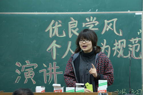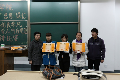 在比赛环节结束之后,辅导员丁蓉蓉老师发表了自己的见解,丁老师认为同学们的演讲极富激情而且充满教育意义。丁老师真挚的希望同学们都能做有素质的大学生,学会感恩和诚信,塑造良好的学风以及养成良好的个人行为规范。最后,由大二辅导员蒋秀英老师上台宣布了获奖人员名单,本次比赛总共有11名同学荣获一、二、三等奖,其余同学则获鼓励奖。