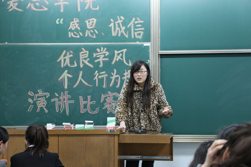 3月27日晚,在爱恩学院5102教室我院举行了“感恩、诚信、优良学风、个人行为规范”四个主题的演讲比赛。参加此次比赛的同学都来自2012级。出席本次比赛的评委和嘉宾是大一、大二和大三的辅导员以及院党总支书记孙礼仕老师。