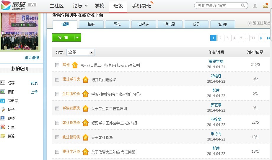 学院是否可以增加一些国际接轨性比较强的专业?”、“为什么要召开家长会?”、“爱恩大一实行小班制,明显感觉大班的凝聚力不够,如何解决这一情况?”、“寝室浴室经常出现堵塞,修理过后没多久又堵了,可否定时疏通?”……在2两个小时的交流中,共有400余名同学踊跃发言,共发表话题249条。在学校易班发展中心的指导和技术支持下,此次在线交流在院级平台设置了“课业学习类”、“学生管理类”、“学院发展类”、“就业指导类”、“生活服务类”和“其他”等六大板块。同学们围绕自己在学习、生活中遇到的问题,存在的困难和困惑踊跃提问,同时也提出了不少建设性的建议。参加互动的老师认真阅读,积极回复,不回避问题和矛盾,与学生进行了坦诚交流。