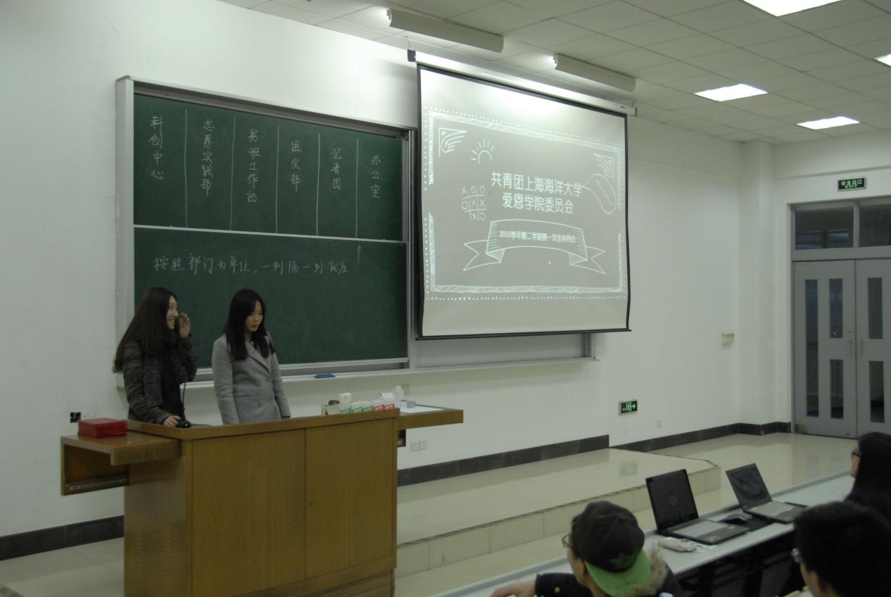 2016年3月13日晚六点,共青团上海海洋大学爱恩学院委员会在轮值主席赵御辰和忻益莲的主持下,在上海海洋大学第一教学楼1203教室召开了2016学年第二学期第一次全体例会。