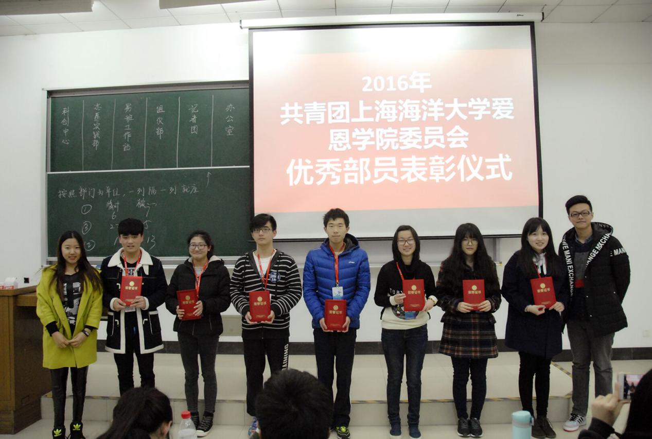 最后,由两位主席对2016年共青团上海海洋大学爱恩学院委员会优秀干事进行表彰。优秀干事包括:陆香健、孙悦、赵帅嵩、包轶谦、李博、全怡臻、陈爱玲。