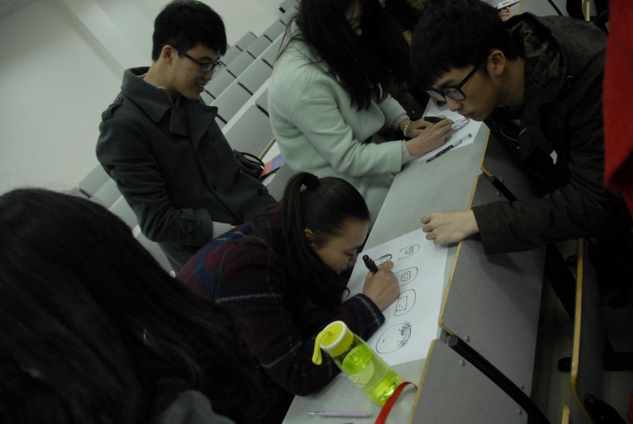 例会从一个小小的热身游戏开始——以画传人。通过将团委全体成员打乱进行分组,在不同部长的带领下进行游戏,从而促进团委成员彼此之间的默契。游戏要求本小组将组内人员的形象画于纸上向全体展示,在保证准确描述成员的同时要想办法让其他小组猜不到。比赛过程中,各个小组各出奇招,比如第一个小组就采用了象形的方式,把成员名字通过不同物品进行表达,例如帆船,小马等。