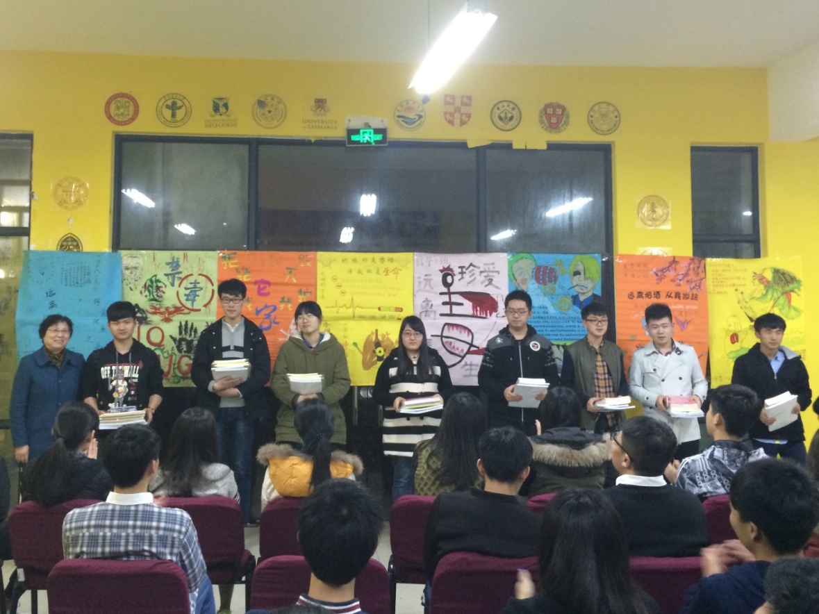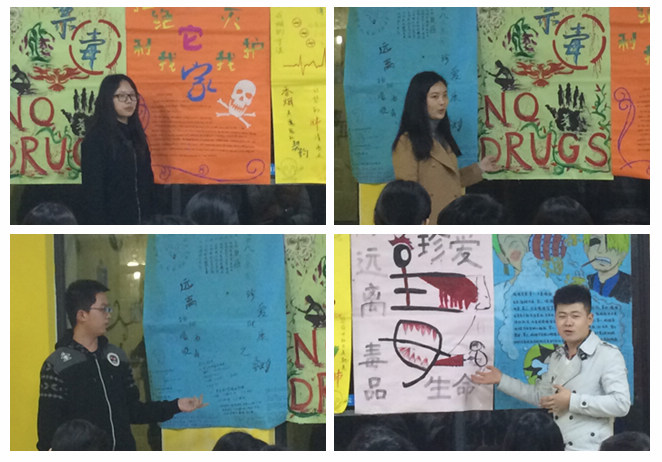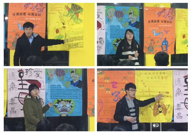 本次社区课堂以自制创意海报的展示及演讲为主要内容来进行评比。2015级各班代表赛前积极准备,运筹帷幄。在演讲中表达流畅,感情真挚,热情洋溢。将珍爱生命,远离烟酒毒,健康生活的理念生动体现,引得在场同学们的共鸣与反思。不管是市营一班还是其他的七个班,大家都讲述着毒品,烟酒所带给我们的危害。特别是2015级信管一班班长董智瑜他富有亲和力的语调,幽默的语言,贴切的生活实例讲述博得全场同学老师的喝彩。