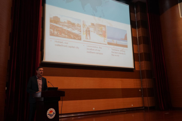 开幕式上,上海海洋大学外事处处长钟俊生致辞,他向远道而来的塔斯马尼亚大学国际友人表示热烈欢迎,他强调上海海洋大学重视拓展学生的国际视野,注重加强国际化平台的建设与合作,上海海洋大学与塔斯马尼亚大学已经是合作多年的老朋友,希望通过这次活动能够进一步加深两校情谊,进一步推动两校的合作项目,并预祝本次活动成功顺利。塔斯马尼亚大学国际部执行总监Ben Jones主要从地理位置、校园环境、招生规模、专业设置、师资课程、录取要求等方面向同学们详细生动地介绍了塔斯马尼亚大学的概况,鼓励同学们在今后的学业规划中可以考虑去塔斯马尼亚大学继续深造。