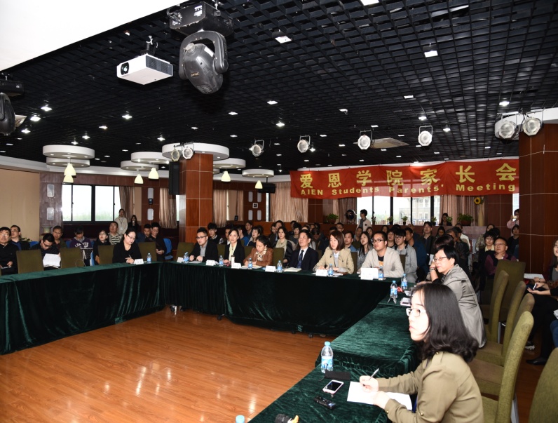 为增强家校之间的联系,使即将步入大四的2013级学生对未来有更充分、深入地了解,2016年4月23日星期六下午1时,上海海洋大学爱恩学院2013级学生家长会在三餐三楼教工之家隆重召开。会议由大三辅导员郭虹老师主持,爱恩学院王基组院长、王娜副院长、杨妍艳书记以及学院院办、教务、培训中心、学工办等各办公室负责人、爱恩集团市场部经理龚健女士等出席此次家长会。