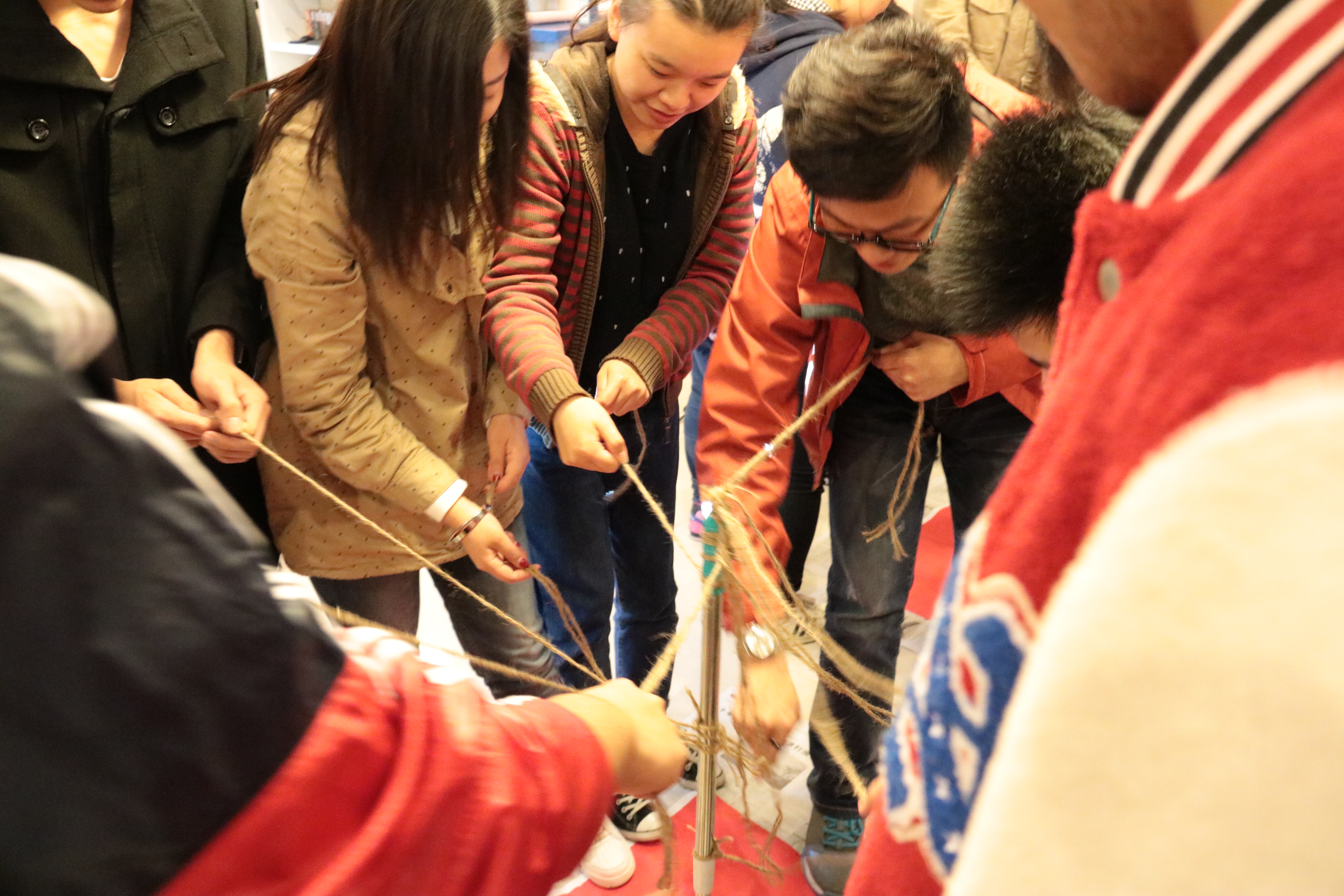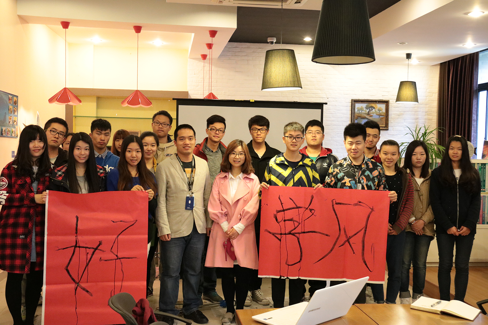 首先,爱恩学院兼职辅导员张烈老师在会初向在座各位学生骨干分享了她在团学工作中的心得与体会,鼓励同学们珍惜作为学生骨干的工作时间和能取得的经验,并认真担起作为学生骨干应尽的职责。随后,张烈老师还为现场的学生骨干进行了财务培训。接着,为加深学生骨干的互动交流,加强大家的团队协作能力,为今后工作的开展营造更加良好的人文环境,在交流会上还开展了一个素质拓展小游戏。游戏中,在场人员需分成两大组,手持不同绳子,同时操控两支毛笔,共同书写有关于“学风”的文字。游戏中由于需要每一位成员共同协作努力的难度让学生骨干们深刻意识到团队合作在工作中的重要性,团队成员之间应相互依赖、共同合作,以此开发团队应变能力和创新能力,从而依靠团队力量创造奇迹。
