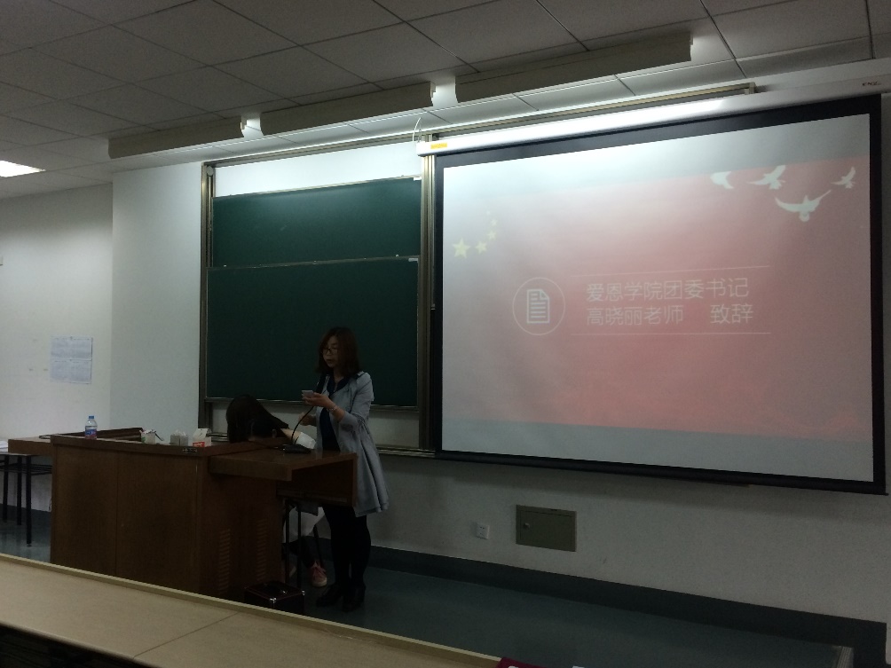 大会由爱恩学生会办公室部长周佳露、文体部部长胡佳怡担任主持,会议的第一个议程是:全体起立,奏唱《光荣啊!中国共青团》团歌,我院全体学生代表齐唱团歌,声音嘹亮,沉浸其中,又一次接受了中国共产主义青年团青春、奋进、热情、积极的精神洗礼。其后爱恩学院团委书记高晓丽老师做了大会致辞,高老师首先向大会的召开表示热烈的祝贺,向与会的各位代表、学院广大学生干部、有志青年致以亲切的问候,并对学生代表大会作为学校联系学生的桥梁和纽带、作为学生参与民主管理的权利机构的定位和意义做了介绍,强调学生代表大会代表学生的利益、权利,并履行应尽的义务。因此,此次出席会议的学院学生代表要履行好自己肩上这一份光荣使命,在充分听取35名候选人预备人选详细介绍之后,慎重投出自己宝贵的一票,选出真正优秀、能够代表我院广大学生行使权利的学校学生代表。5月选举换届完成后,我院学生会将会在学院团委的指导下,不断完善提升、精耕细作、深化服务。此外,高老师也向广大团学骨干提出四点要求,希望大家时刻以党员标准严格要求自己,让优秀成为习惯;坚持加强政治理论学习,明确政治立场,树立正确的世界观、人生观、价值观;刻苦钻研专业学习,做学习的标兵;在同学中树立良好的威信,传递满满正能量。