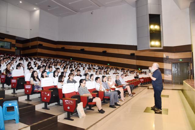 第一节2015级的塔大导向课是在大学生活动中心举行的。会场座无虚席,全年级同学都准时到场,等候课程的开始。课程由塔大科学工程技术学院Dean Steer博士主持,爱恩学院院长王基组、副院长王娜,塔斯马尼亚大学商学院Sarah Dawkins博士、两位注册协调员Ben sellers和Karen Hughs,教务主管倪瑾老师以及大二年级辅导员秦梅老师一同参加了课程。Dean Steer博士祝贺大家顺利成为塔大的学生,王基组院长用流利的英文再次祝贺了全体2015级爱恩学子,并提了三个问题,希望他们认清自己、早日确立未来的目标,在未来的三年找到自己人生的方向,早日获得成功。第一堂导向课以爱恩学院市场营销专业协调员Sarah Dawkins博士的发言作为大会的结尾,全场同学有序退场,前往二教进行第二堂塔大的导向课。