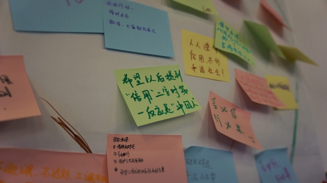 活动的最后,每一位同学都写下了自己对于信用的承诺与期待,贴在了墙上的信用树上。并一起喊出了我们的口号“我们在一起,把信用传出去!”此次的信用课堂在和谐与欢乐中落下了帷幕。在回忆此次课堂的同时,我们也期待下一次课堂上能有更多的小伙伴与我们一起,为诚信生活一起献出自己的力量!