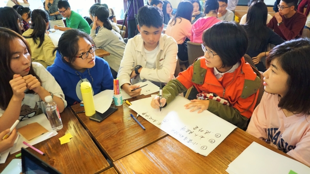 课堂一开始,所有同学被分为了“信”“用”“之”“旅”四个小组。每组同学在进行自我介绍后,一起讨论,决定出自己队的队名与口号。