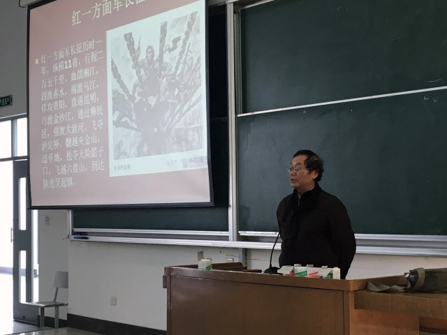 讲座开始,黄老师讲述了什么是长征,红军为什么要长征和长征要到哪里去。“每一场革命都有它自身的传奇”,而长征,就是这样一个震古烁今的不朽传奇。历时两年,中国共产党领导的红军如滚滚铁流,纵横十余省,长驱数万里,战强敌、跨激流、翻雪山、过草地,最终胜利会师陕甘宁,完成了震惊世界的万里长征。长征的伟大壮举,是以理想为魂、信念为魄,浴血奋战、坚定前行,经受住了上百万国民党军队围剿的考验,也经受住了党的“左”和“右”的错误干扰的考验,突破了人类的生存极限,最终铭刻在中国革命和中国民族史册上的伟大史诗。“长征一完结,新局面就开始。”在历史坐标系中,长征是一个醒目的转折点,它标志着中国共产党从幼稚走向成熟,党和革命的事业从挫折走向胜利,也意味着中华民族从苦难走向辉煌。黄老师强调:“长征是一次理想信念的伟大远征;长征是一次检验真理的伟大远征;长征是一次唤醒民众的伟大远征;长征也是一次开创新局的伟大远征。”