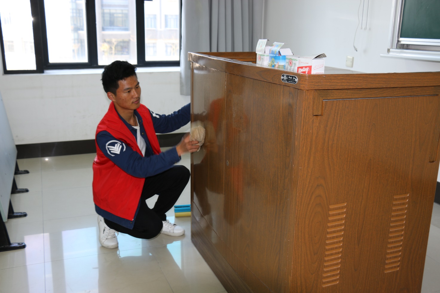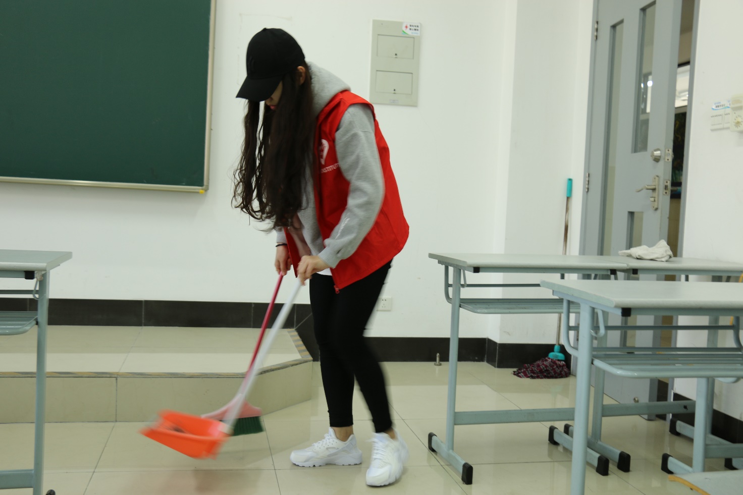 爱恩学院大一至大三的志愿者首先在指定好的地点一号教学楼进行集合,手中拿着打扫工具,有组织、有纪律的进行分配,到达教学楼之后,他们很快行动起来,拿着扫把往各个教室走去,把教室里的纸屑灰尘等认真地打扫干净。就像雷锋曾说过:“把有限的生命投入到无限的为人民服务中去。”或许,不是每个人都能够成为雷锋,但同学们可以尽自己最大的努力做自己力所能及的事情。由于打扫的地点主要是教室,为了不打扰到同学们学习,他们都非常自觉地放轻脚步,小声地说话,然后小心奕奕地把课桌椅摆放好。在他们一个多小时的努力下,原本乱糟糟的教室变得整洁,给在那儿学习的同学们带来一个更加舒适的学习环境。