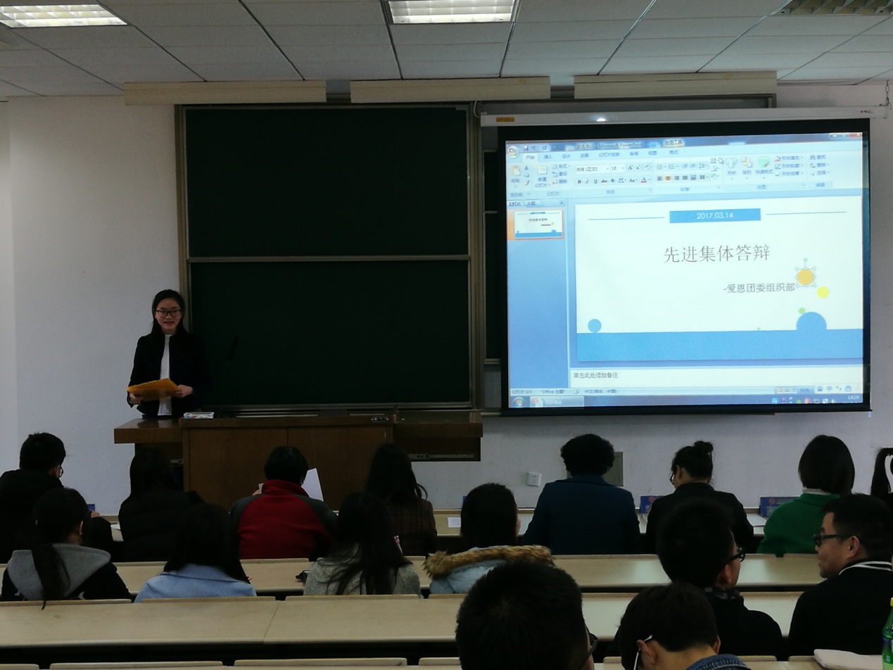 紧接着于下午两点,在爱恩学院楼5102教室举行了上海海洋大学爱恩学院先进集体答辩会。本次答辩会共有九个班级参加,分别竞选“红旗团组织”和“特色团组织”的荣誉称号。本次答辩各班分别从班级学风建设、凝聚力建设、易班建设、班级组织化管理、积极参与院校文体活动等方面详细地展示了各班在过去一学年中取得的优秀成果。