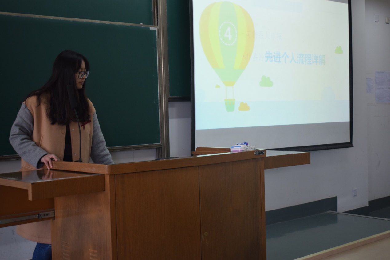 本次培训主要为团支书们讲解了几个常见的团务方面的问题和团支书在先进奖项申报中所需完成的工作。组织部的侯郡部长首先为大家解答了团员证和入团志愿书丢失该怎么办等问题。为了让团支书更清楚地了解先进奖项申报工作,侯郡部长又为大家详细讲述了先进集体和先进个人的申报流程。先进集体需要先向联系人申报,再为班级准备答辩和所需PPT;而先进个人的评选,则需要团支书收集材料,然后由评议小组决定名额后上交至辅导员处。最后在座的团支书提出了自己的疑问,侯郡部长都一一为大家解答。