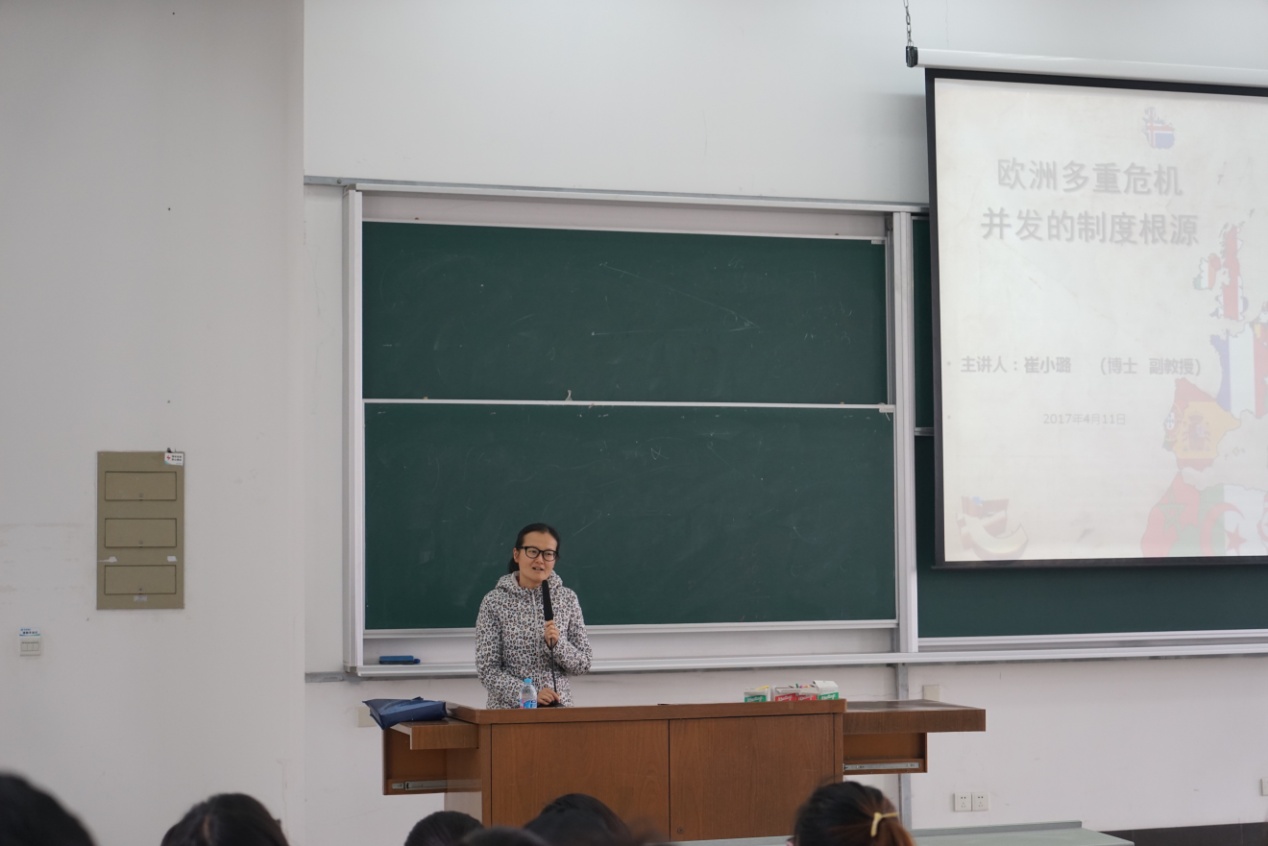 2017年4月11日下午两点三十分,在上海海洋大学2203教室,上海海事大学副教授崔小璐博士为爱恩学院2016级市场营销专业的同学们带来了主题为“欧洲多重危机并发的制度根源”的精彩课程。