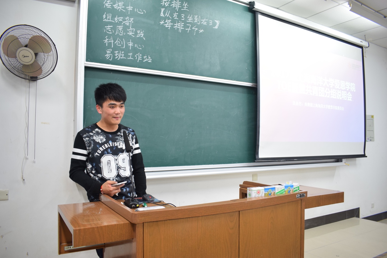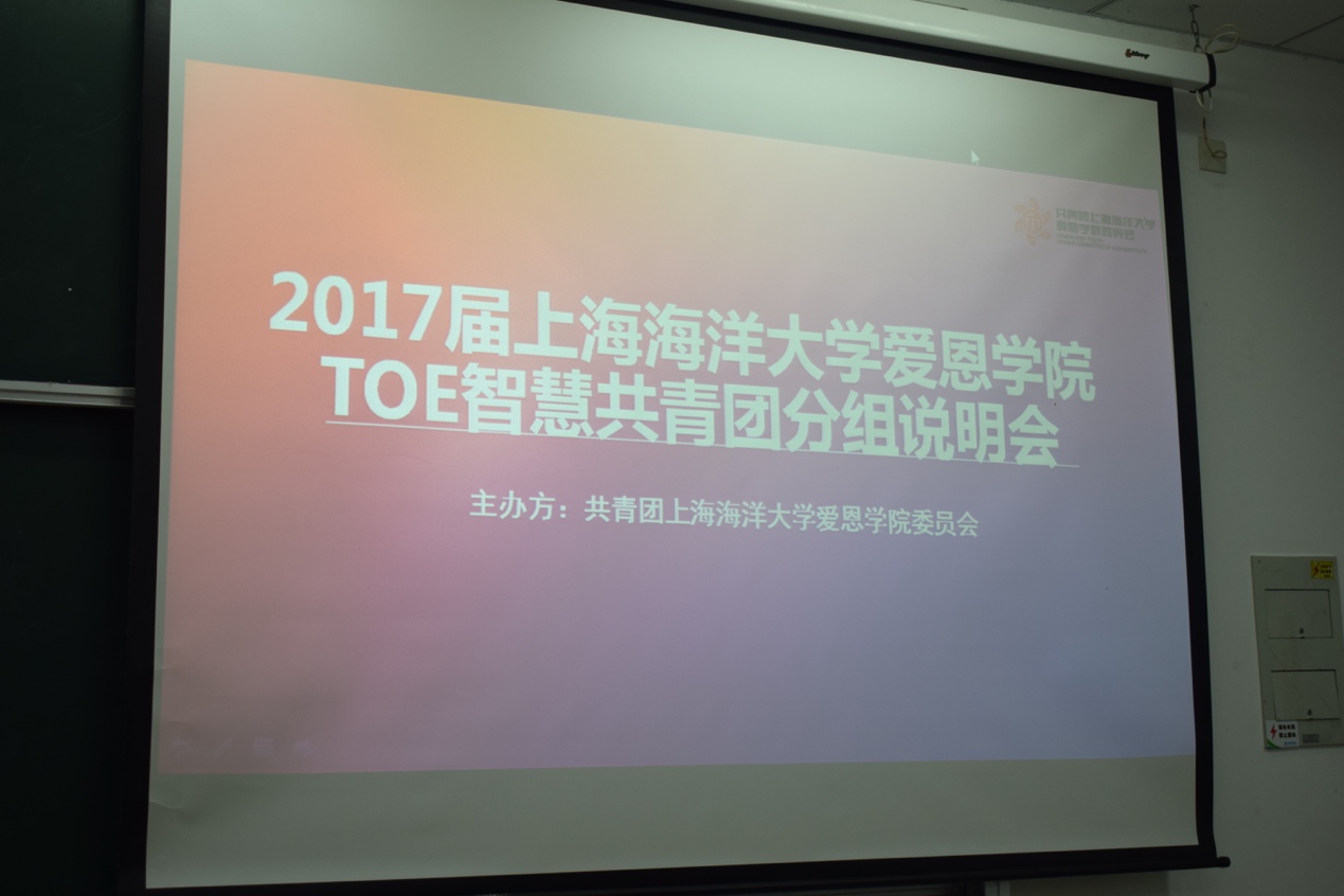 2017年5月4日20:45,2017届上海海洋大学爱恩学院TOE智慧共青团分组说明会在一教1110教室顺利举行。爱恩学院团委的传媒中心部长陈爱玲和组织部部长陆香健主持了此次活动。爱恩学院团委等学生骨干参与了本次活动,认真聆听爱恩学院的TOE活动内容,并积极踊跃地参与智慧共青团建设。