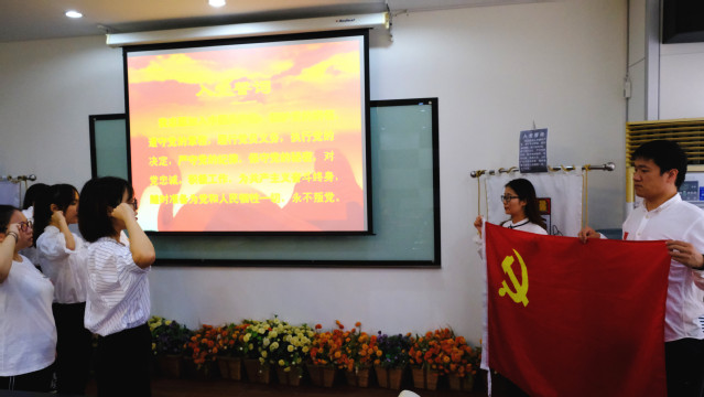 伴随着雄伟的《国际歌》,宣誓仪式正式拉开帷幕。在学生第三党支部书记马春广的主持下,与会各党员观看了《永不忘却的誓言》。通过回顾井冈山斗争时期的入党誓词,与会党员感受到了凝缩在誓词背后的共产党人的初心和不能忘却的使命。在这样的感召下,全体新发展预备党员举起右手面向党旗,跟随学生第四党支部书记崔晓慧一起庄严宣誓,表达对党的忠诚和为共产主义事业奋斗终身的决心。宣誓结束后,支部书记马春广和崔晓慧分别为预备党员佩戴党徽,颁发党章。
