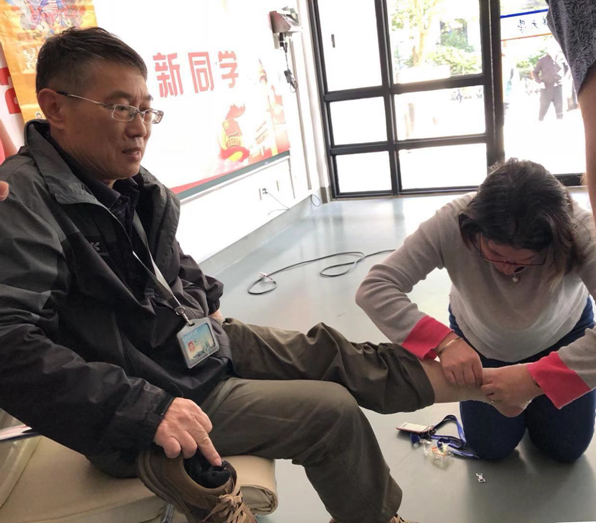 10月31日中午时分,学院郝玉明老师在三餐食堂吃好午饭下楼梯的时候,一脚踏空把左脚扭了,当时疼痛难忍,根本无法站立,一起下楼的朱立群老师和孙晓昕老师,马上把他抬到学院西头大厅休息,在等出租车的过程中,席朝茜老师找来冰块给郝老师敷上;路过的塔大老师Erin看见了,马上飞奔上楼,从办公室里取来绷带为郝老师包扎好,动作娴熟得俨然像个医生。不一会儿,车子到了, 郝玉明老师到医院进行检查和治疗,检查结果告知,骨头无大碍,大家都松了一口气。