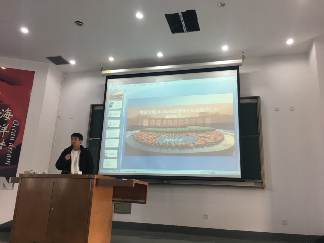 诚信是中华民族的传统美德,是青少年学生的立身之本。为严肃考风考纪,规范考场秩序,形成风清气正的考试环境,爱恩学院2017级信管专业于2019年12月11日在5201教室召开了考前诚信教育大会,本次大会由辅导员丁少岩老师主持,2017级信管专业全体学生参与。