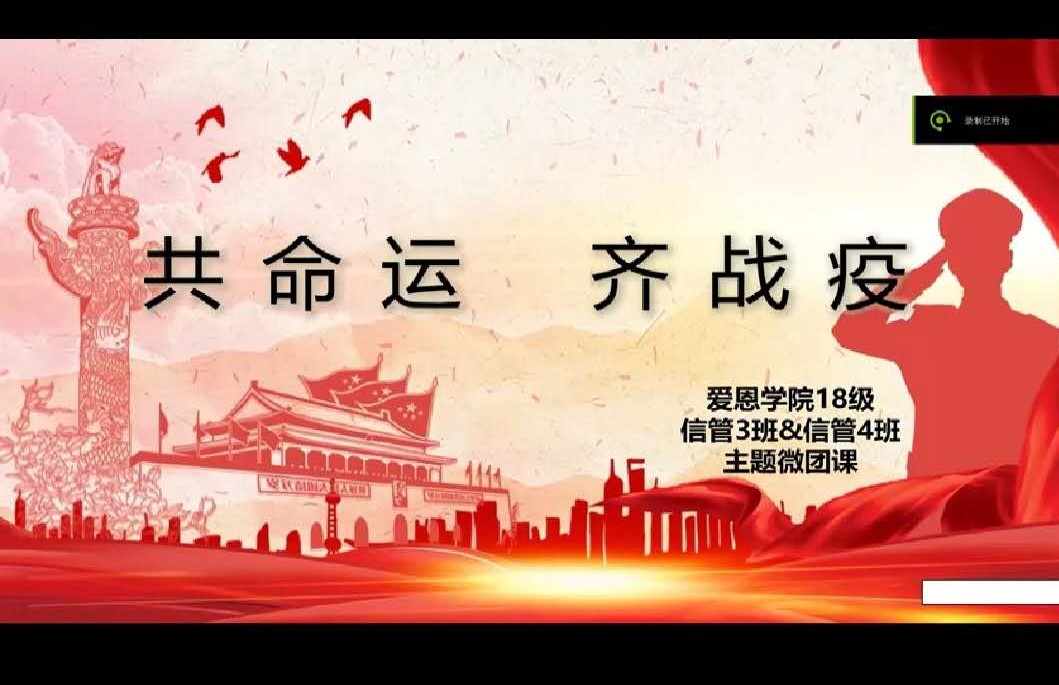 为坚决打赢疫情防控的人民战争、总体战、阻击战,进一步激发广大团员青年的责任担当,爱恩学院2018级信息管理与信息系统第四团支部积极响应校团委号召,组织开展以“人类命运共同体下的防疫抗疫合作”为主题的“疫情防控青年说”主题微团课。