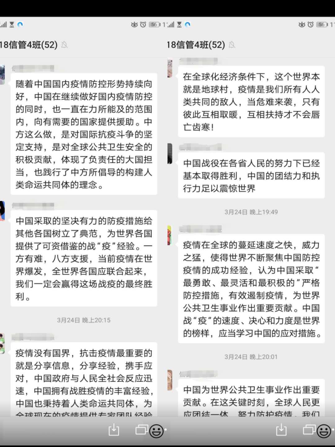 自由讨论环节,支部成员们就微团课内容展开热烈讨论,并纷纷在留言区发表见解。刘卓燃表示:“疫情没有国界,抗击疫情最重要的就是分享信息,分享经验,携手应对,积极开展国际联防联控。相信在全世界人民的共同努力下,疫情一定会早日结束。”胡浩南认为,中国对国际抗疫斗争的坚定支持,是对全球公共卫生安全的积极贡献,体现了负责任的大国担当,也践行了中方所倡导的构建人类命运共同体的理念。“中国采取了‘最勇敢、最灵活和最积极’的严格防控措施。”杨亦晨感慨道,“我们为有效遏制疫情、为世界公共卫生事业作出了重要贡献。”在良好的交流和互动中,团员们充分提高了防疫抗疫意识和思想觉悟。