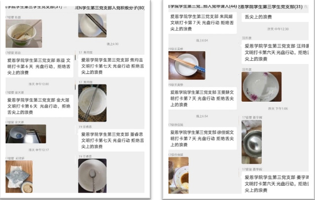 学生第三党支部“光盘行动”打卡活动为期一周,受到党支部成员的积极响应,党员、入党积极分子、入党申请人共计93人每日在群内积极进行光盘打卡。大家一起“光盘”,拒绝舌尖上的浪费,每个人都是“光盘行动”的践行者、示范者和传播者。分享交流会上大家逐一交流心得体会。18信管项天歌认为,青年一代要厉行节约,文明用餐,学会按需点餐,按量取食,一起“光盘”!17信管周琪认为,一粥一饭,当思来之不易,半丝半缕,恒念物力维艰,生活在这个美好幸福的年代,我们更要学会珍惜。18信管何欣宇聚焦社会热点,从吃播、大胃王等短视频提出深刻思考,认为米粒虽小犹不易,每个人都该为杜绝舌尖上的浪费贡献力量。