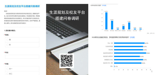 项目前期,指导老师与项目组成员多次召开线上会议,讨论相关事宜。为全面了解在校大学生的实际需求,团队成员制作并发放了一份以“学生生涯规划及校友平台搭建”为主题的问卷,并随之开展数据分析。
