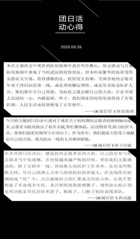 本次团日活动加深了团员们对伟大抗疫精神的理解。张韵琪有感而发:“正是全国人民团结一心,共献温暖,才使得我们国家的疫情发展得到有效控制,人民生活恢复正常秩序。”王田雨表示,“我为始终坚守在一线的抗疫工作者们感到骄傲,我们广大青年要学习他们的这种坚守精神。”受到先进榜样的感召,2018信管3班的团员们积极报名参加“一对一”迎新志愿者活动,协助新生融入校园,起到了很好的引领作用。