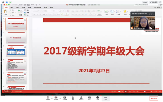 疫情防控常态化背景下,为保证学生顺利返校,进一步推动2021届毕业生就业创业工作,2月27日晚,爱恩学院2017级市场营销专业通过线上腾讯会议召开了新学期年级大会。会议由爱恩学院2017级辅导员兰璐主持。