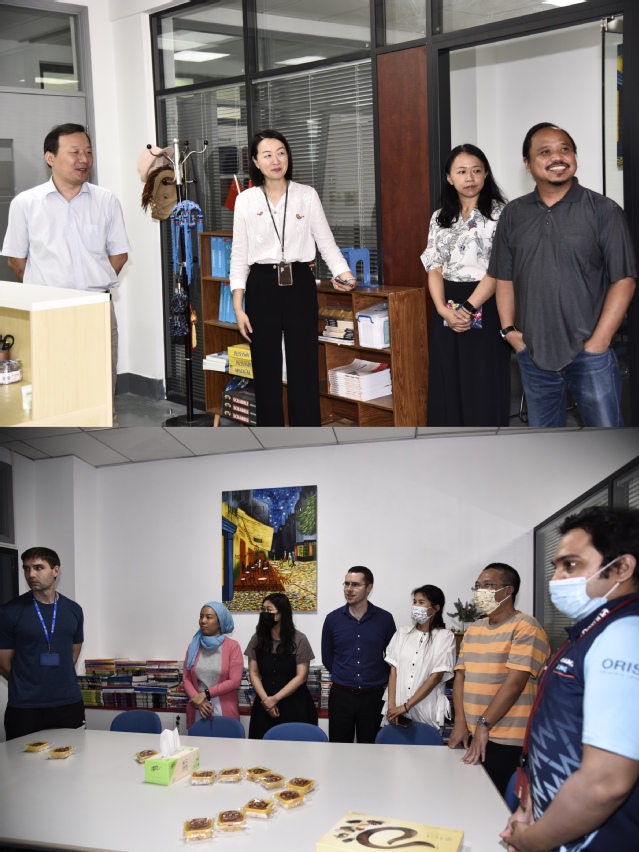 会后,学院领导班子亲切慰问了外教团队。学院外教全力配合疫情防控各项工作,克服与家人不能团聚的困难,坚守教学一线。学院班子感谢外教对学院工作的支持,并送上中秋慰问品,希望外教继续以饱满的工作热情投入到新学期教学工作中。