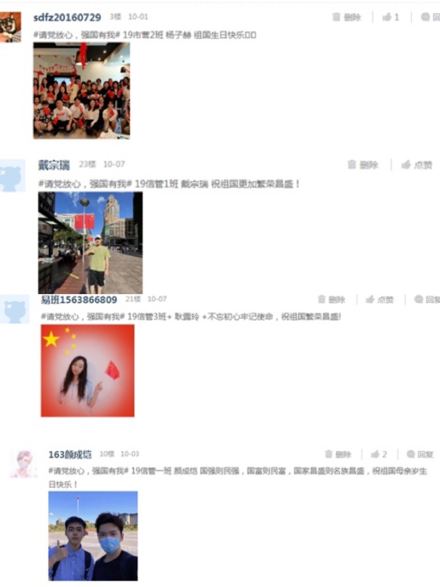 在“请党放心,强国有我--与国旗合影,向祖国告白”活动中,同学们通过易班平台踊跃投稿,积极分享自己与国旗的创意合影,花式晒出对祖国的深情告白。仰望着这面鲜红的旗帜,同学们以灿烂的笑容、自信的目光传递出了对祖国的热爱与祝福,他们的一张张笑脸定格在鲜艳的国旗旁,他们用最简单、最质朴的方式,向国庆献礼、向祖国致敬。截至10月15日,活动页面浏览量达489条,独立访客有326位,签名墙数据近91条。