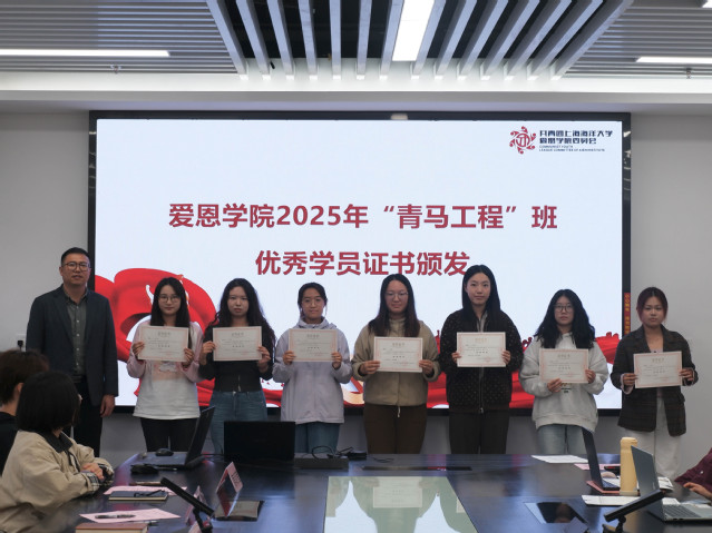 11月5日下午,爱恩学院2025年“青马工程”班结业仪式在爱恩学院B110会议室召开。爱恩学院党委副书记卢克祥、学生第三党支部书记马春广、学生第一党支部书记丁少岩、学院团委书记席朝茜、团委副书记孟佳妮、学业促进工作室指导老师兰璐及2025年“青马工程”班全体学员出席本次会议,结业仪式由爱恩学院学生唐筱珺主持。