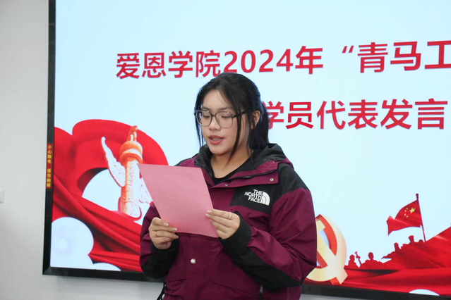 2024年“青马工程”班优秀学员代表郑祁分享了她在培训中的收获和感悟。她表示,在参加“青马工程”培训班的过程中,她经历了从理论认知到实践践行、从基础学习到深度探索的多层次成长,那些浸润思考的知识、饱含温度的实践、并肩同行的时光,都已成为她成长路上最珍贵的印记。她希望新一届学员带着在“青马工程”班收获的信念与力量,持续深耕理论学习、积极投身实践行动,将知识转化为服务社会的过硬本领。